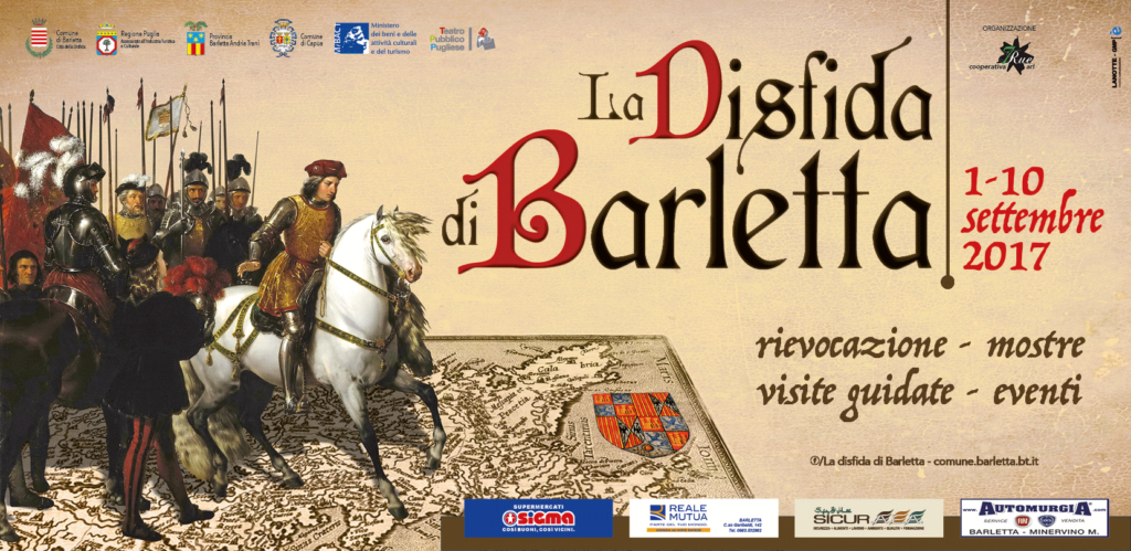Nel 514° anniversario de la Disfida di Barletta la città pugliese si prepara a rivivere le gesta bellicose che videro il trionfo dei tredici cavalieri italiani sui tredici cavalieri francesi nel1503. La città di Barletta sarà luogo di rievocazione degli eventi sia editi dalla penna di Massimo D’Azeglio, il quale romanzò l’episodio storico, sia documentati dalle fonti storiche.